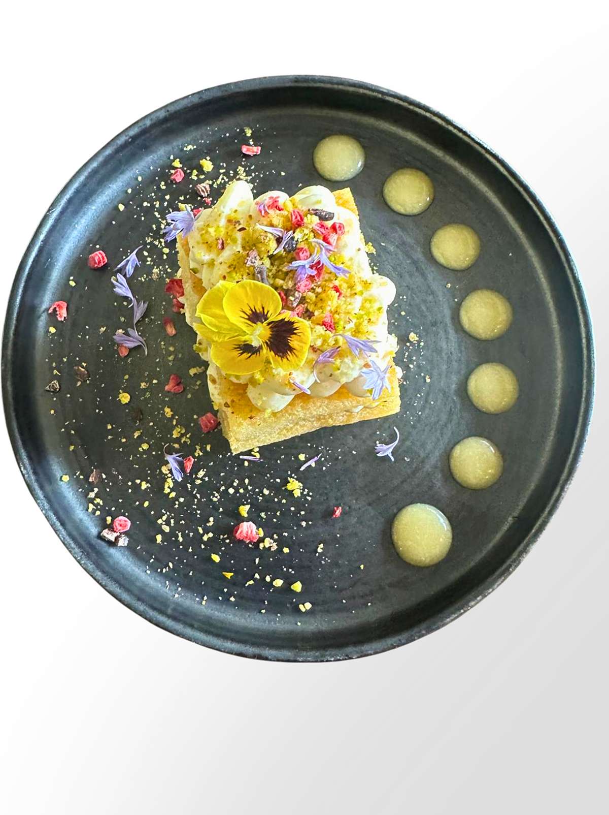 Golden sponge with rum-caramelized tropical fruit, served warm with Chantilly cream quenelle and edible flowers