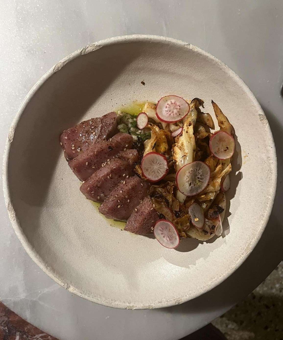 Grilled amberjack with burned baby gem, seasonal greens, and “avgolemono”
