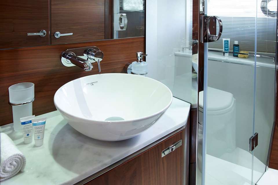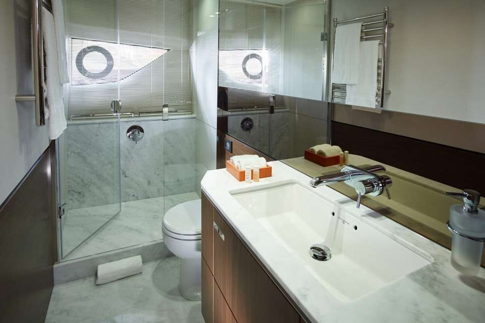 Starboard side guest cabin with a twin bed convertible into double, and en-suite bathroom.