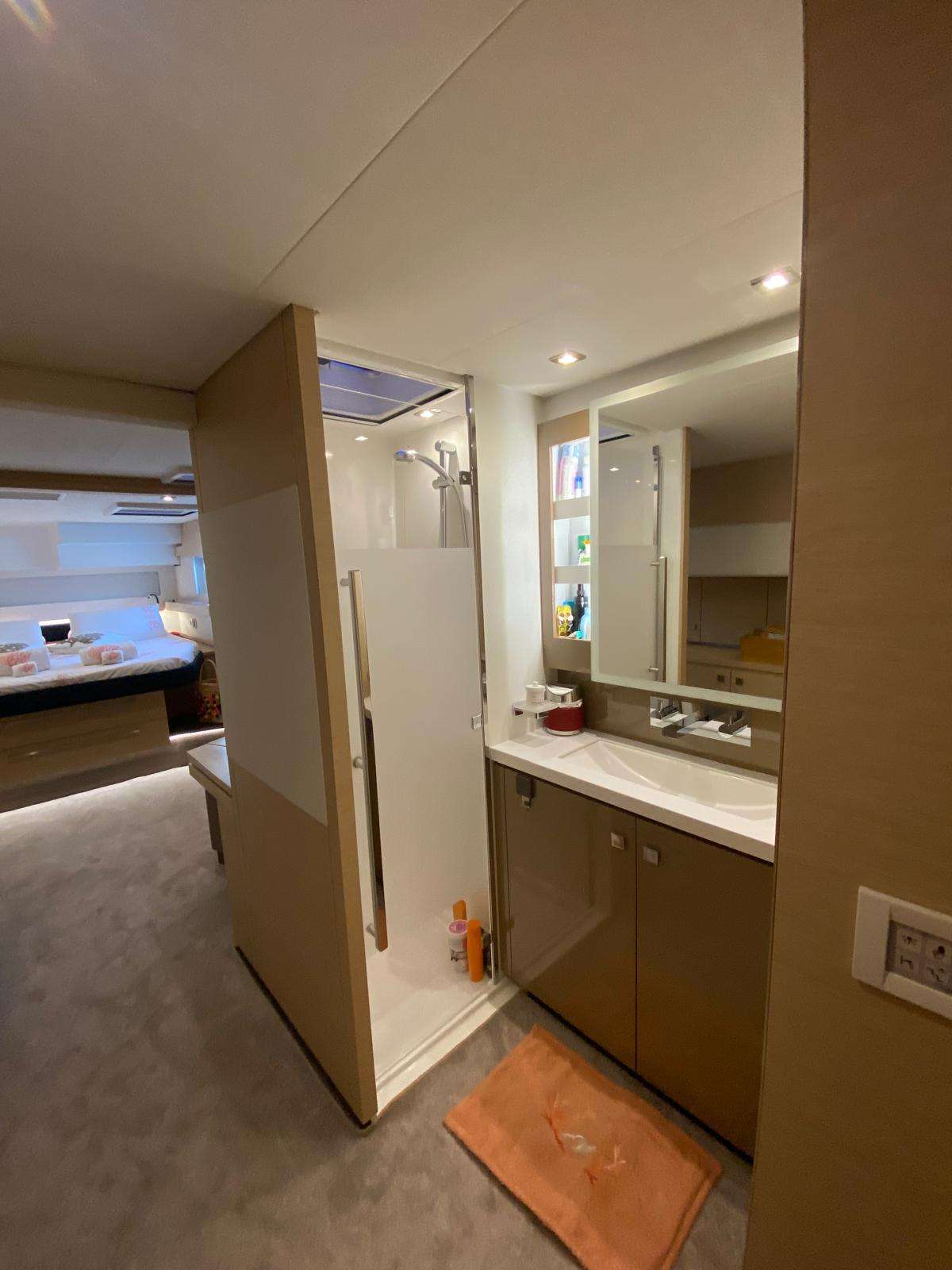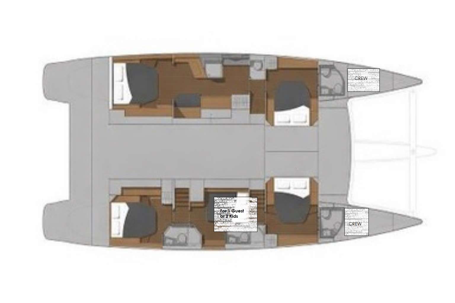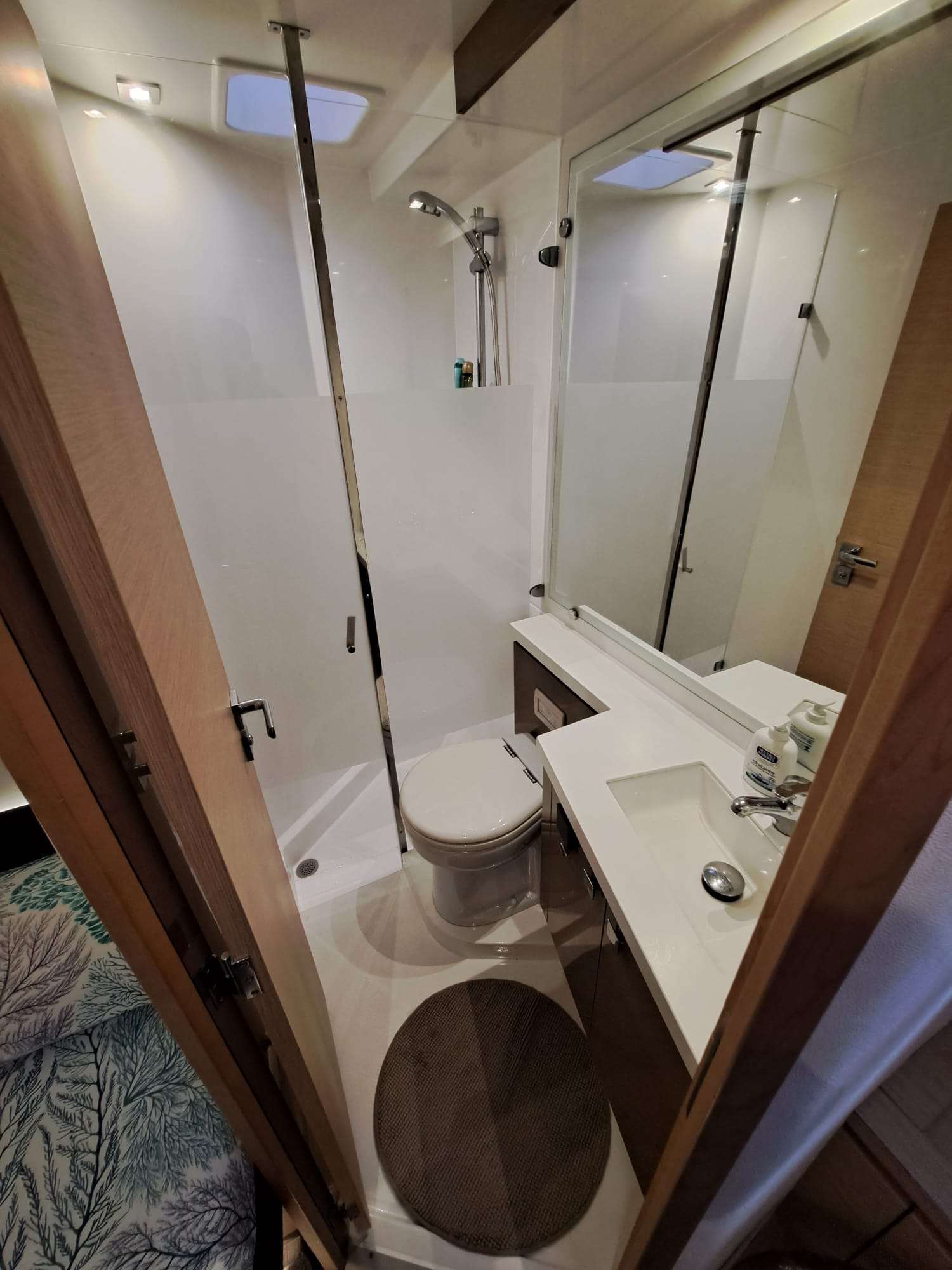 1 owner’s cabin aft, 3 cabins with double beds (200 x 158 cm), 1 cabin with a large single bed (197 x 131 cm). All cabins feature en-suite bathrooms